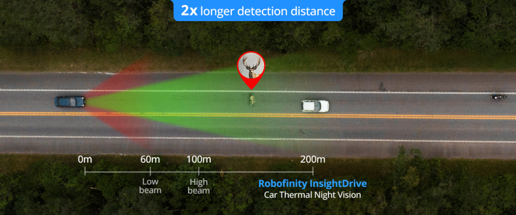 See Beyond Headlights: Advanced thermal imaging lets you spot animals, pedestrians, and vehicles up to 656 feet (200 meters) ahead—even in total darkness, heavy rain, fog, or snow.