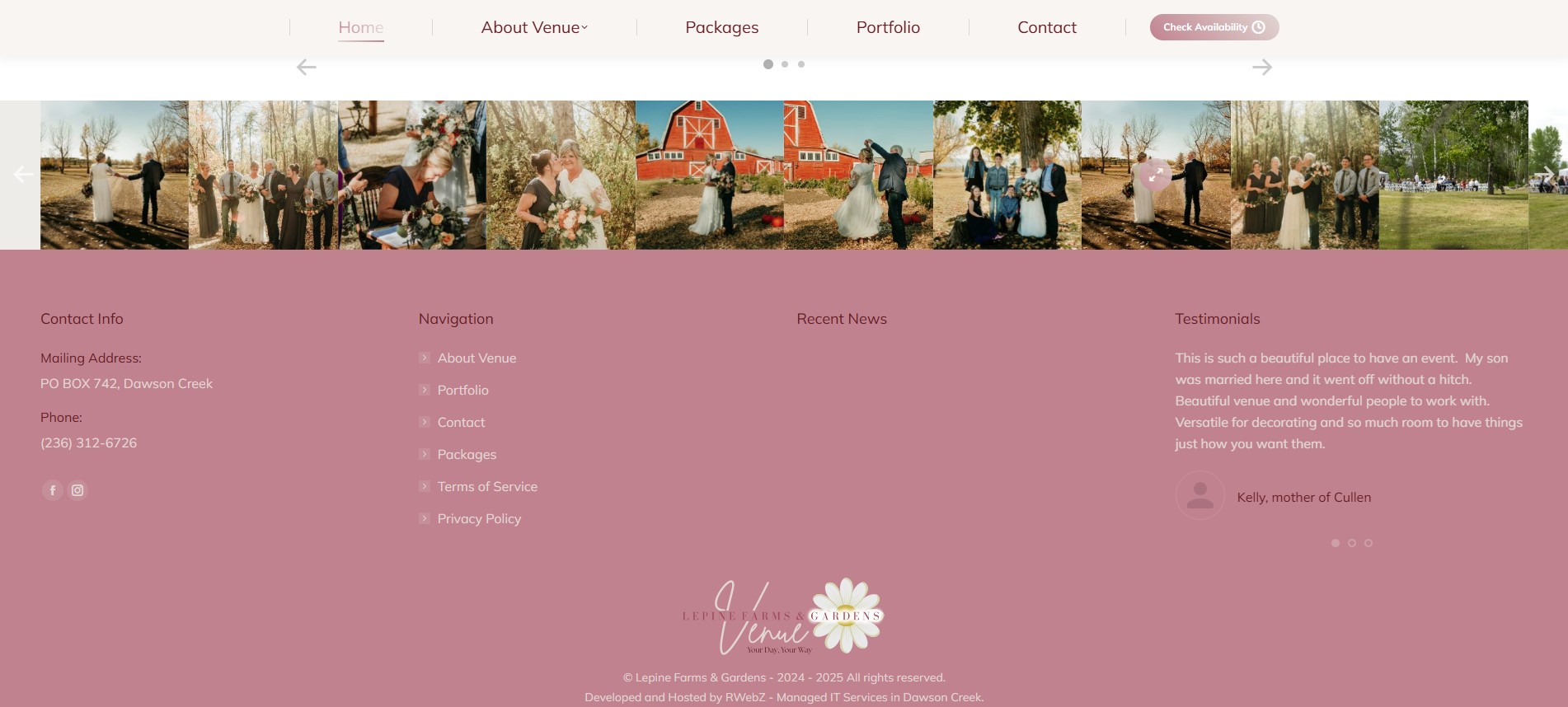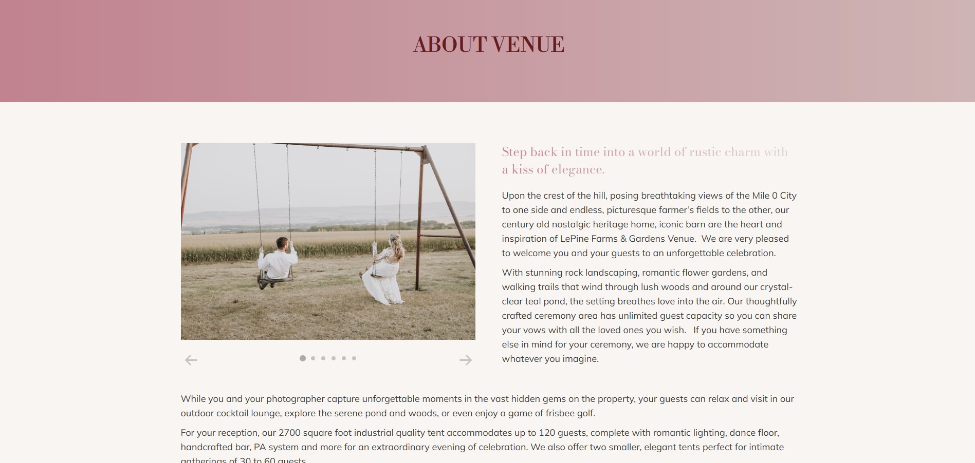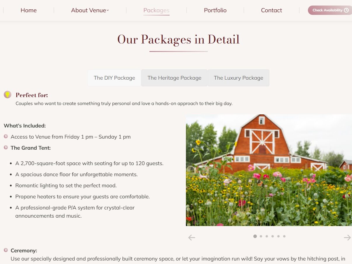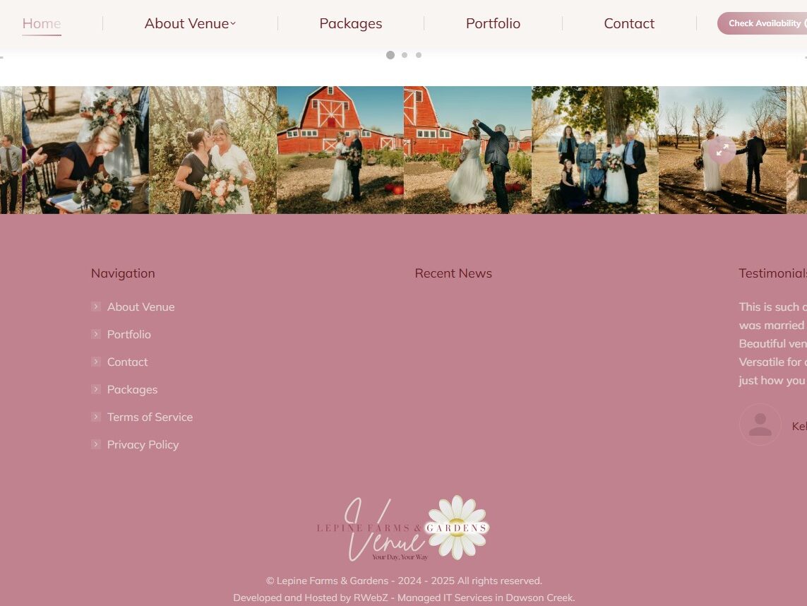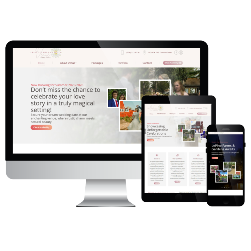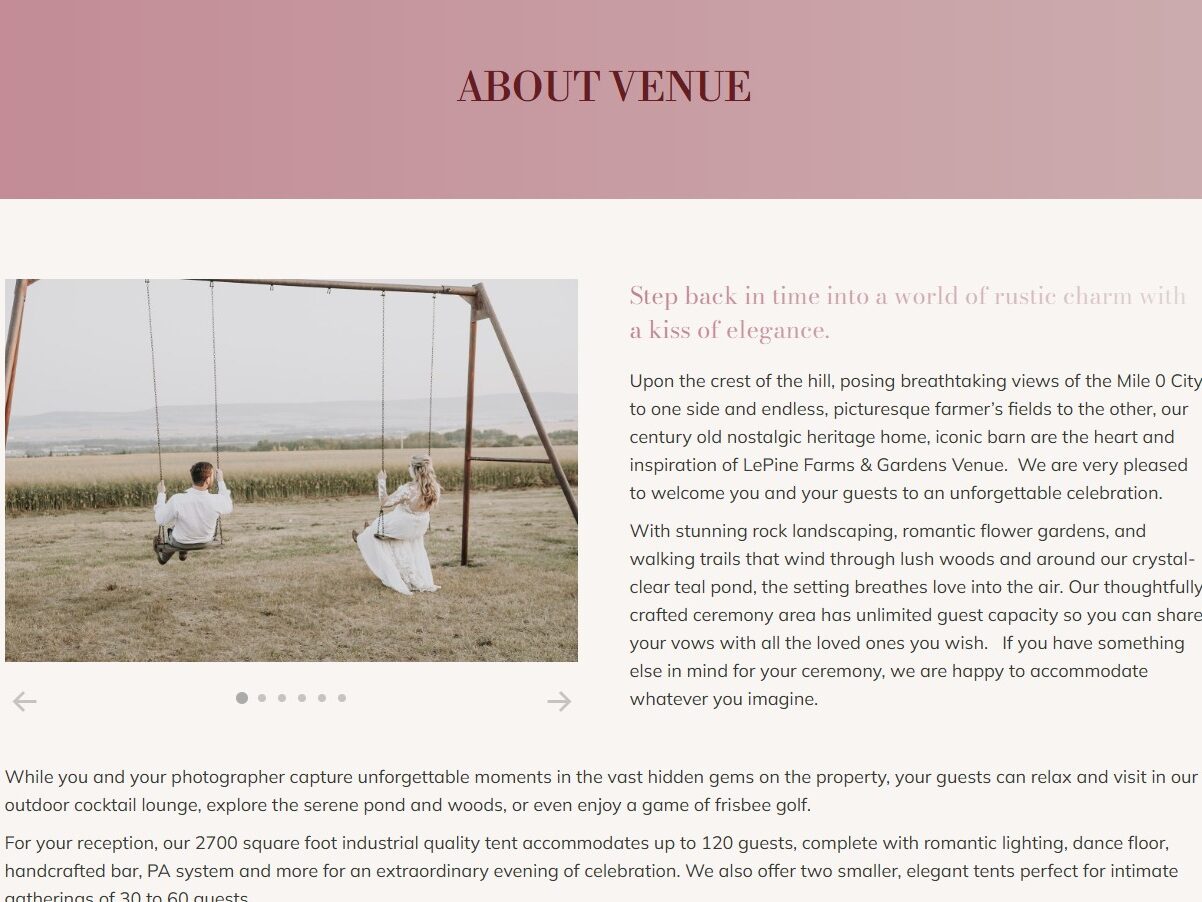 Lepine Farms & Gardens Venue is a charming rustic-elegant wedding and event destination in Dawson Creek, British Columbia. Situated on a hilltop with panoramic views, this century-old heritage farm offers a unique blend of nostalgic charm and modern amenities. The venue features stunning landscaped gardens, walking trails, a serene pond, and versatile event spaces, including a 2,700 square foot tent and smaller elegant tents for intimate gatherings. With a commitment to authenticity, adaptability, and community enrichment, Lepine Farms & Gardens provides a picturesque setting for unforgettable celebrations while supporting local heritage and fostering connections in the Dawson Creek area.